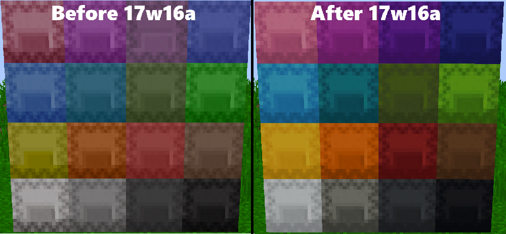 Een vergelijking van banieren voor en na de kleurenpaletwijzging in 17w06a. Afbeelding is getweet door Jeb.[2]