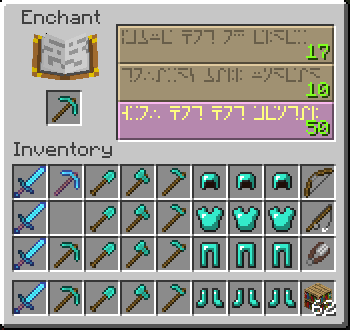 - On October 1st 2011, Notch tweeted an image of the enchantment screen, with enchantments written in the Standard Galactic Alphabet.[5] The first enchantment translates onto "Well Played Internets You Are Good", the second translated into "These Names Will Be Random And Confusing", and the third translates to "Each Spell Costs Experience Levels". The Standard Galactic Alphabet or SGA was originally created by Tom Hall for use in the Commander Keen series of computer games.[6]