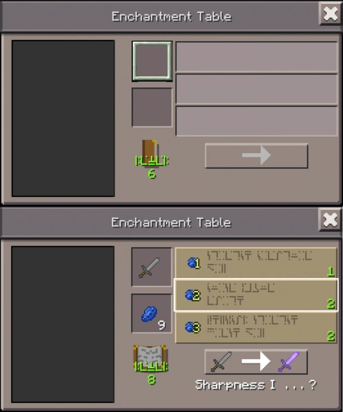 Betoveringstafel met interface. Boven: zonder voorwerp. Onder: met een te betoveren voorwerp en lapis lazuli. Eén van de mogelijke betoveringen wordt getoond.