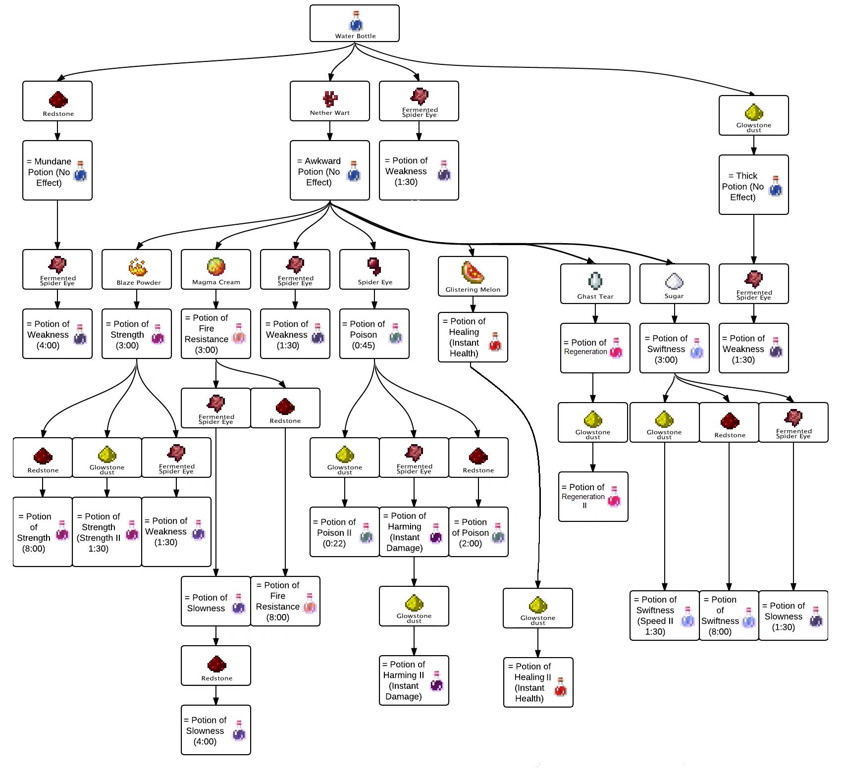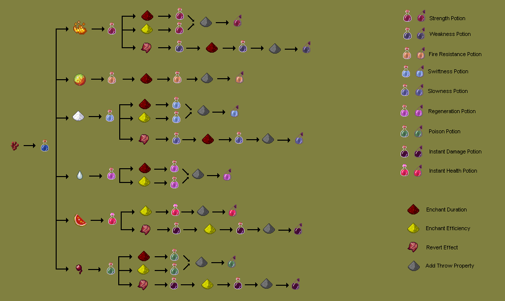 Zoals je kan zien in de brouwkaart rechts, is de eerste stap van de meeste dranken het brouwen van een Vreemde drank, door het plaatsen van Netherkruid boven de waterflessen in het "brouwrooster". Verschillende dranken worden dan gemaakt door verschillende ingrediënten toe te voegen aan een Vreemde drank. Vervolgens, kunnen tertiaire ingrediënten toegevoegd worden om het drankje in een bepaalde manier aan te passen. Een algemene regel, het toevoegen van redstonestof zal de duur van het drankje verbeteren, het toevoegen van gloeisteenstof zal het drankje beter maken, en een gefermenteerd spinnenoog toevoegen zal het effect van het drankje verderven. Tenslotte, spattende dranken kan gemaakt worden door buskruit toe te voegen. De maakt het mogelijk om het drankje te smijten als een wapen.