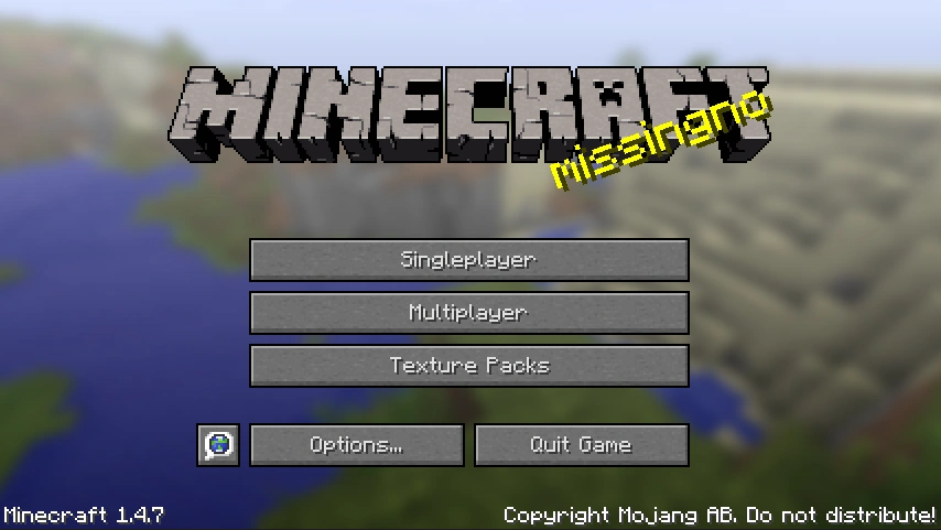 If one were to delete the file splash.txt without deleting the META-INF folder, the splash text on the title screen would appear to be missingno. This is a reference to the infamous Glitch Pokémon, MissingNo.