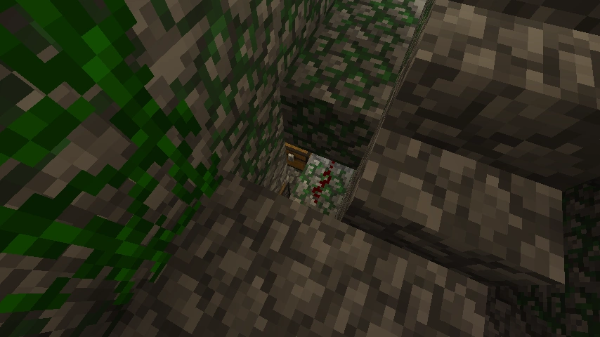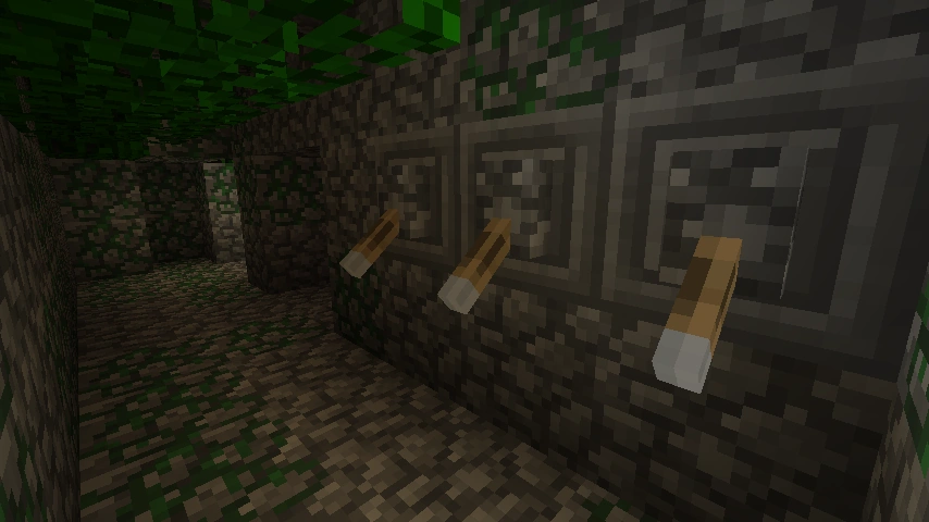 When attempting to access the chest, the player must take care not to step on the Tripwire in the middle of the hall. Though looking like mossy cobblestone, hidden behind some vines is a Dispenser filled with arrows. The Dispenser will fire when the Tripwire is stepped on or broken without Shears.