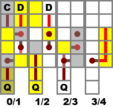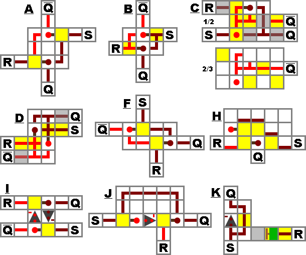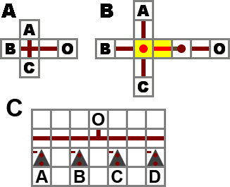 Elk symbool representeert een of meerdere blokken (een representeert drie), gezien van boven. Alle beschrijvingen zijn in verwijzing met "grond level".