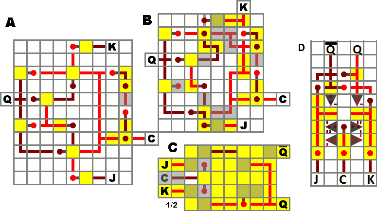 Een simpelere versie van de OR gate is design A: enkel een draad dat alle invoer en uitvoer verbind. Maar, dit zorgt dat de invoer moet worden "gecompromised", zo dat ze alleen gebruikt kunnen worden in deze OR gate. Als je de invoer ergens anders nodig hebt, is versie B nodig.