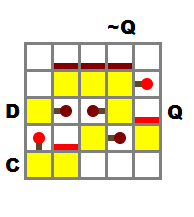 Dit is waarschijnlijk de kleinste memory apparaat dat mogelijk te maken is in Minecraft. Zie dat Q betekent het tegenovergestelde van Q, bijv. wanneer Q aan is, Q is uit en vice-versa. Dit betekent dat in sommige gevallen, Je een NOT gate kan verwijderen door simpel de Q uitvoer te gebruiken ipv een NOT gate na de Q uitvoer.