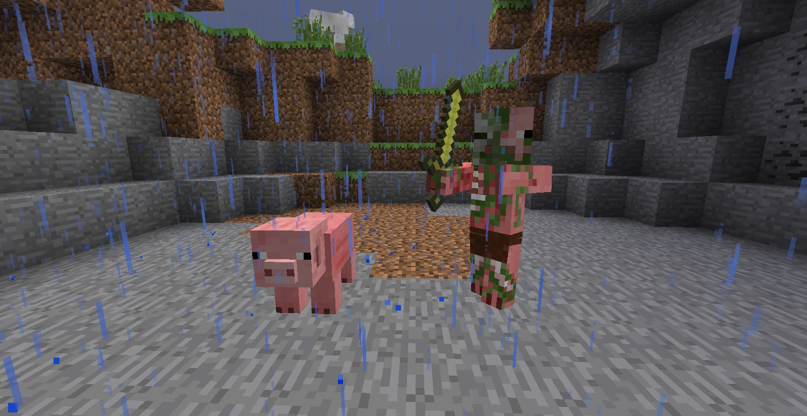 Een varkenzombie in de bovenwereld in een onweersbui waarin hij is ontstaan. Hij staat naast één van de varkens met wie hij enkele ogenblikken geleden nog rondliep.