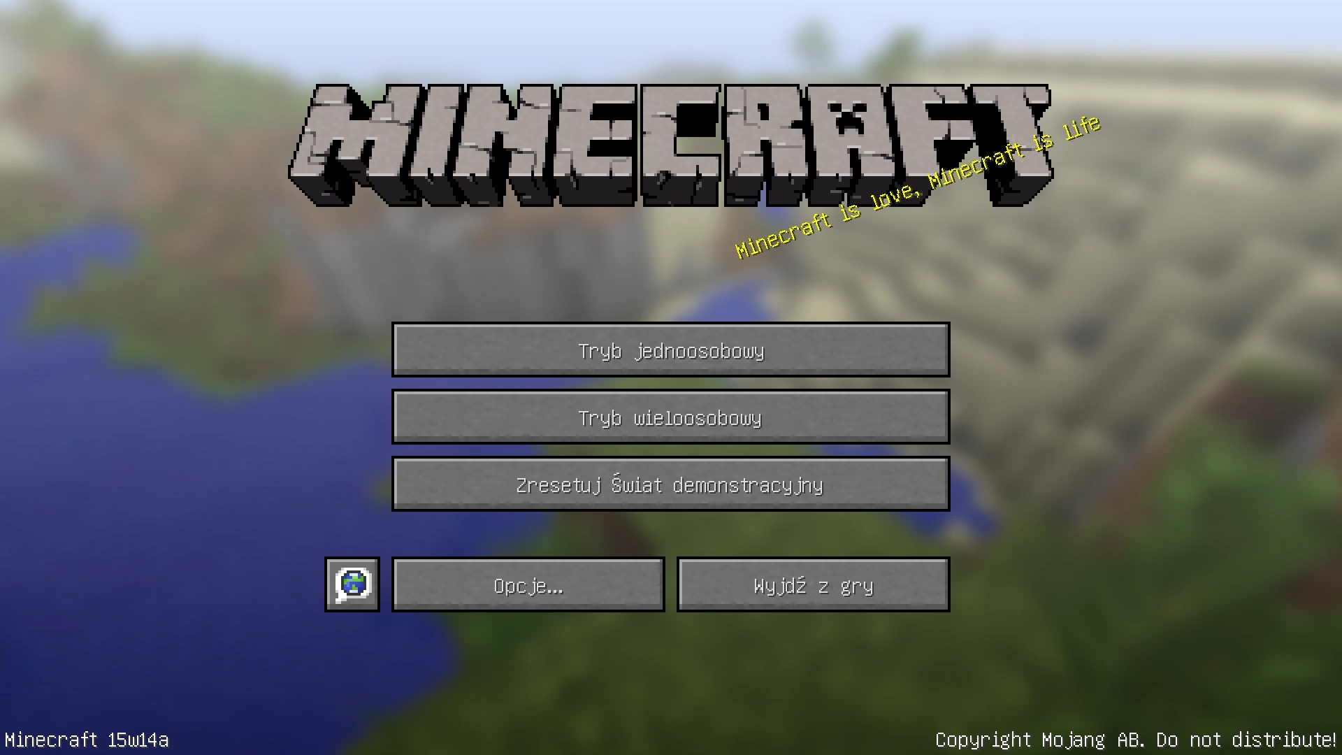 - Wyświetlany jest tylko jeden splash "Minecraft is love, Minecraft is life", czyli po polsku "Minecraft to miłość, Minecraft to życie". Jest to nawiązaniem do filmu na serwisie YouTube "Shrek is love, Shrek is life"[1][2].