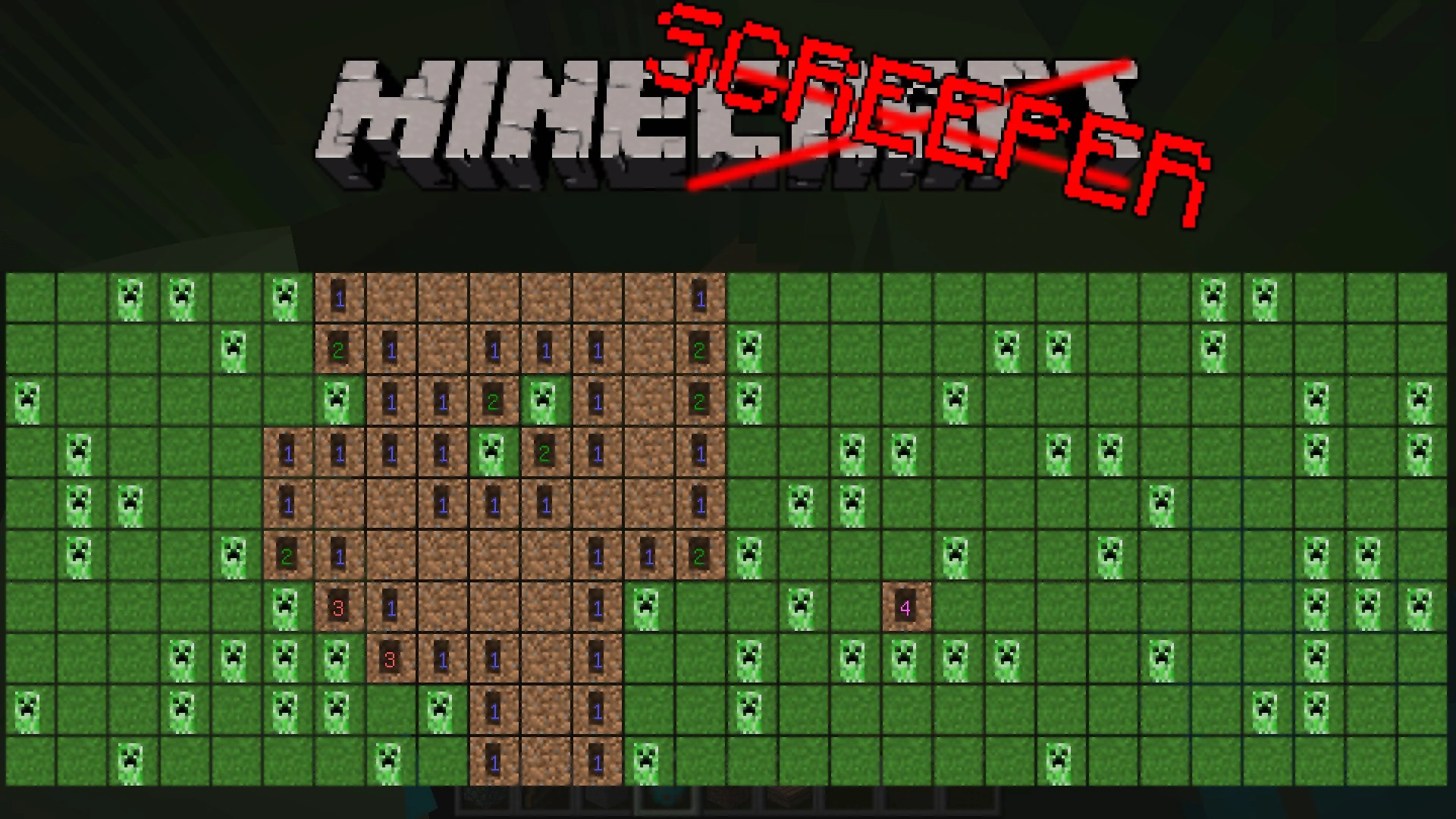 - Nad planszą pojawia się logo Minecrafta, lecz słowo "craft" jest przekreślone czerwoną linią i nad nią jest napis "Minescreeper"