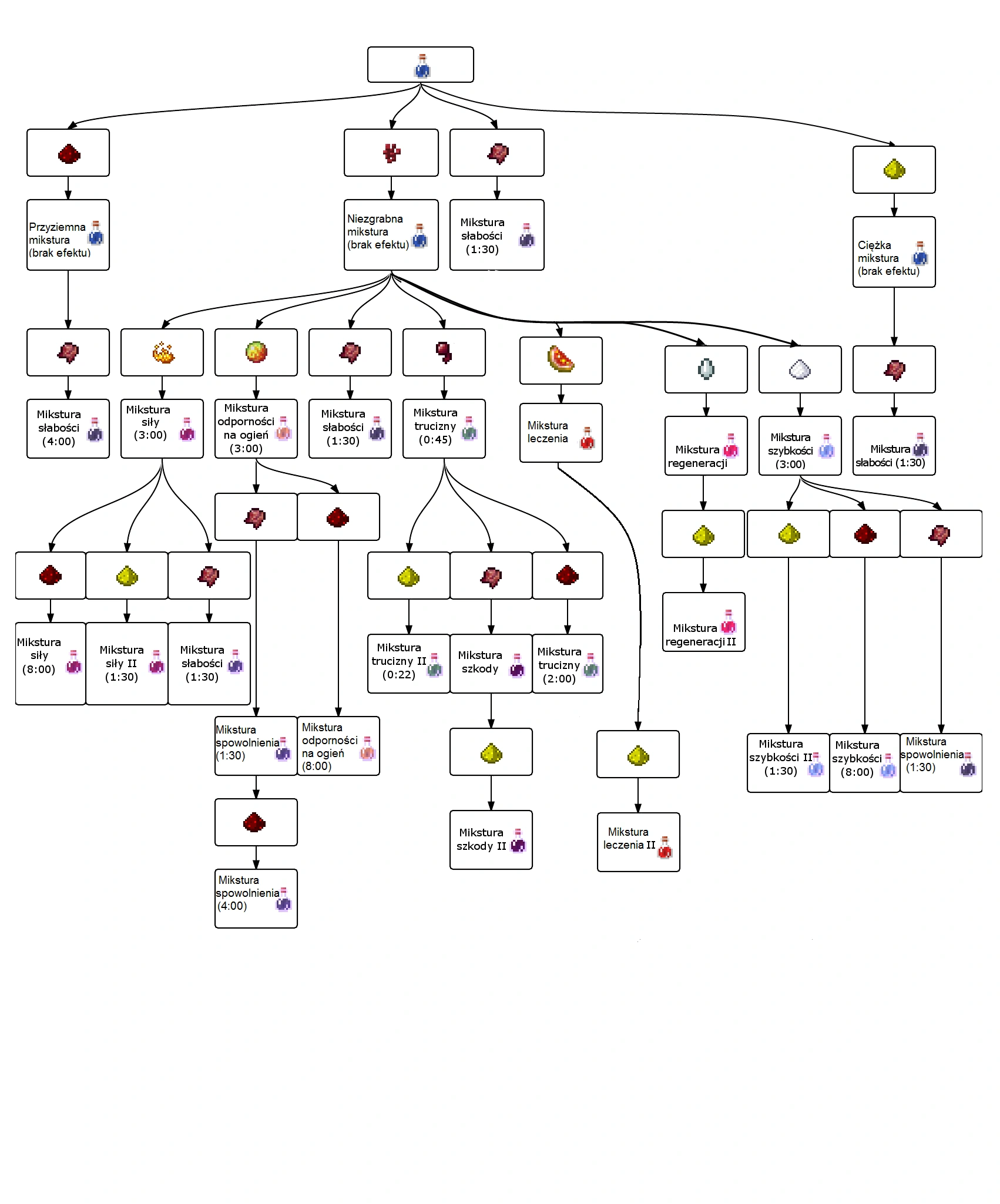 | Glowstone (pył) | Glowstone (pył) | Ciężka mikstura | Zwiększa efekt, Zmniejsza czas trwania mikstury |