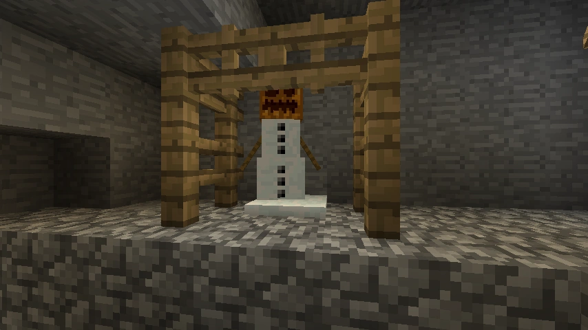 - Bałwan nosi dynię tak jak może to robić gracz, a jego oryginalna twarz jest widoczna od wewnątrz moba.