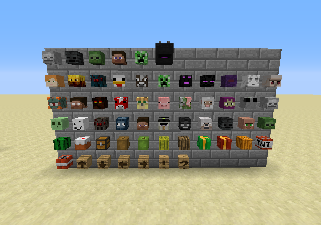 Mojang AB stworzył wiele kont, które mają głowy zwierząt oraz niektórych bloków[4][5]. Takie głowy można stworzyć wyżej napisaną komendą, tyle że jako nick gracza należy użyć nazw podanych poniżej: