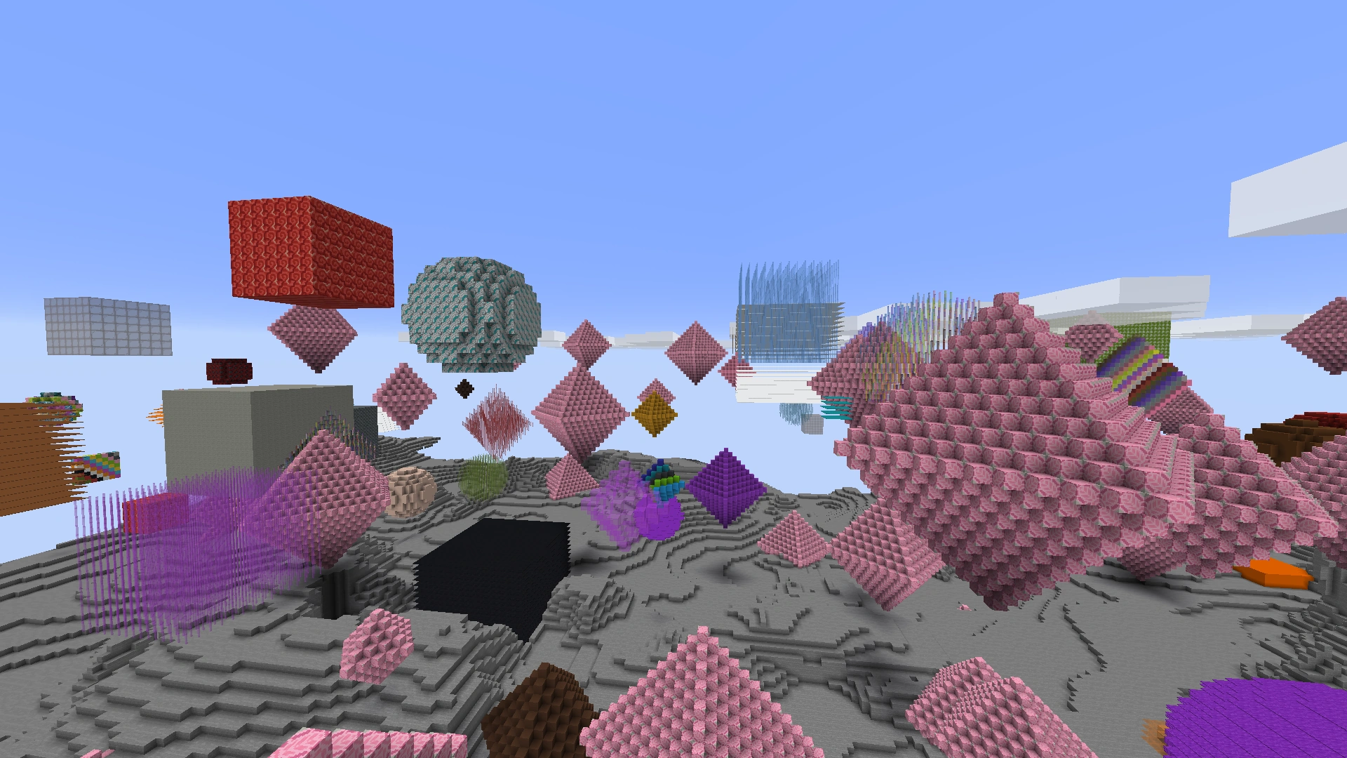 - Wszędzie generują się bryły (kula, sześcian oraz dwie połączone podstawami piramidy), stworzone z kolorowych bloków (cement, beton, terakota, oszklona terakota, wełna, dywany, szyby, szkło).