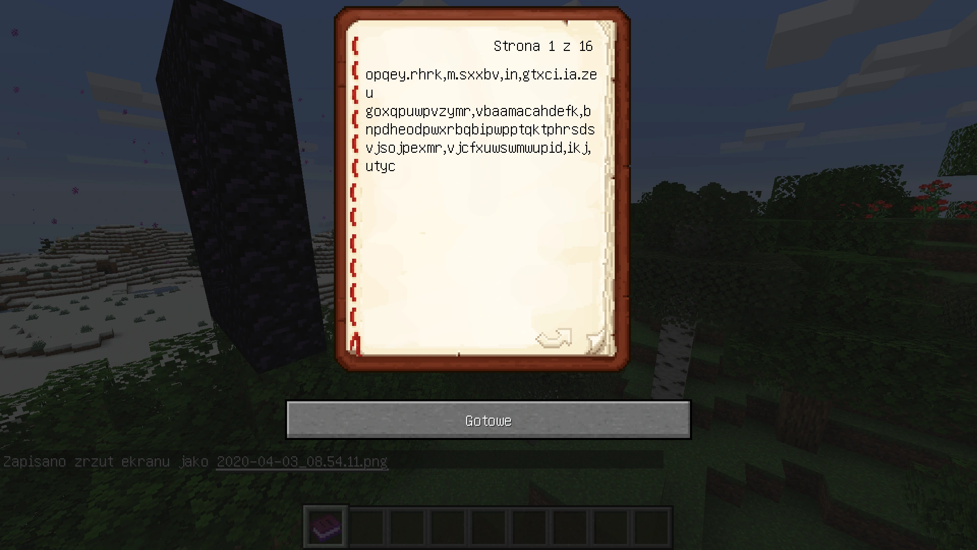 nether_portal. - Można utworzyć go poprzez wrzucenie zapisanej książki lub książki z piórem do portalu Netheru.