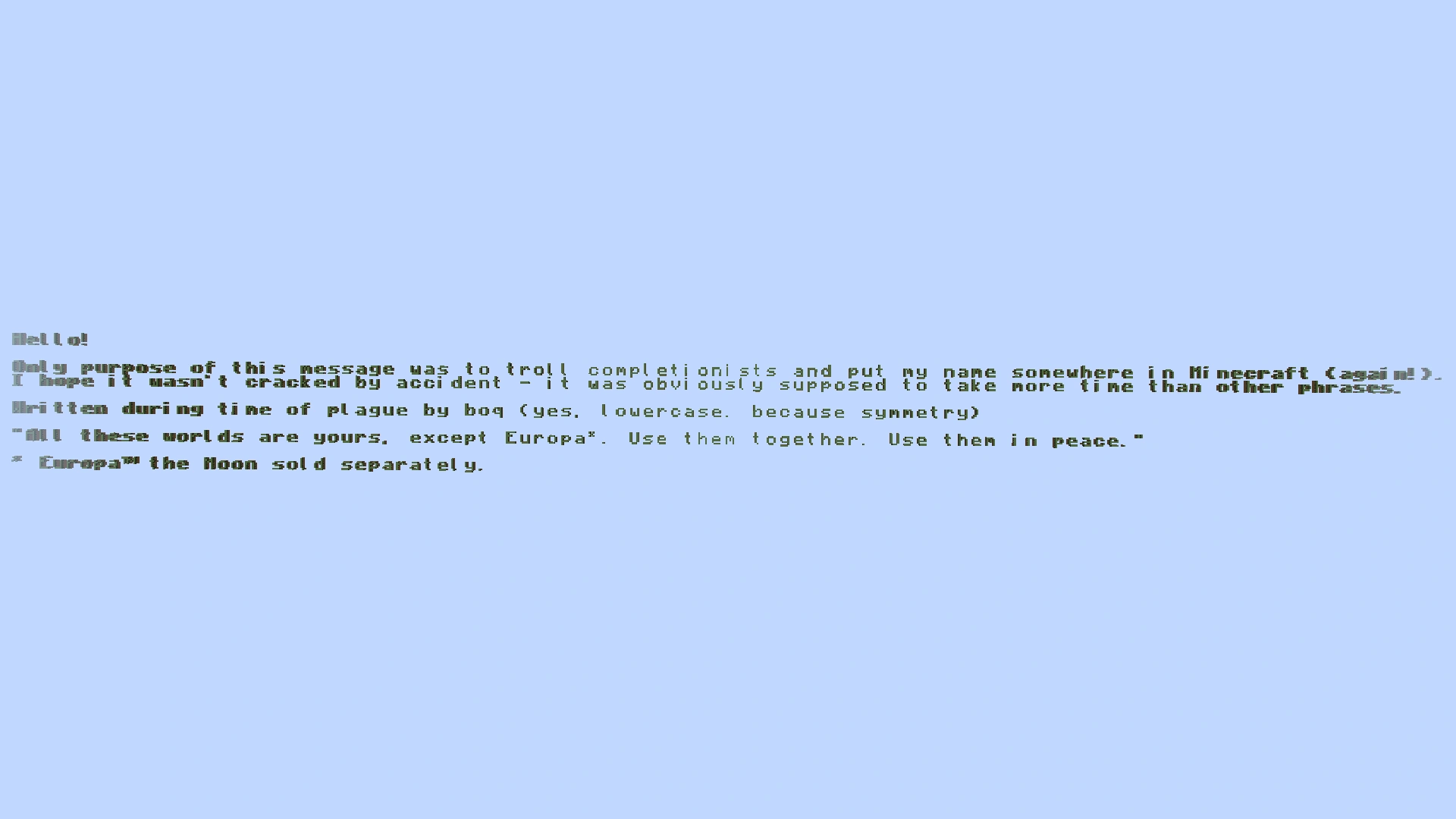 | “ | Hello! Only purpose of this message was to troll completionists and put my name somewhere in Minecraft (again!). I hope it wasn't cracked by accident – it was obviously supposed to take more time than other phrases. Written during time of plague by boq (yes. lowercase. because symmetry) "All these worlds are yours, except Europa*. Use them together. Use them in peace. " *Europa™️ the Moon sold separately. | „ |