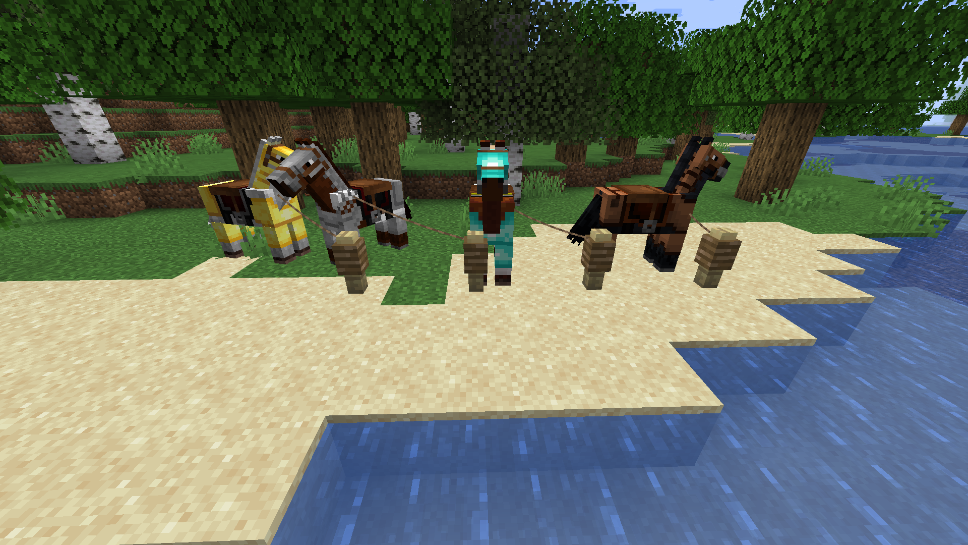 Aby kierować koniem, musimy na niego założyć siodło. Konie mogą nosić koński pancerz, który zmniejsza zadawane im obrażenia. Pojawił się również snop siana, który służy jako pokarm dla konia i blok, do którego podchodzi.