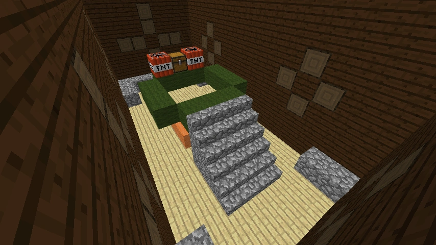 | 1x2_b1 | Redstonowe więzienie | Pokój z mechanizmem otwierającym drzwi. Pomieszczenie jest zamknięte dwoma żelaznymi drzwiami. Dźwignia i pył czerwonego kamienia służą do ich otwarcia. W środku jest strefa z łukami z bruku, brązowym dywanem i kociołkiem. Obrońca zawsze się tu pojawia. | 211 Bruk