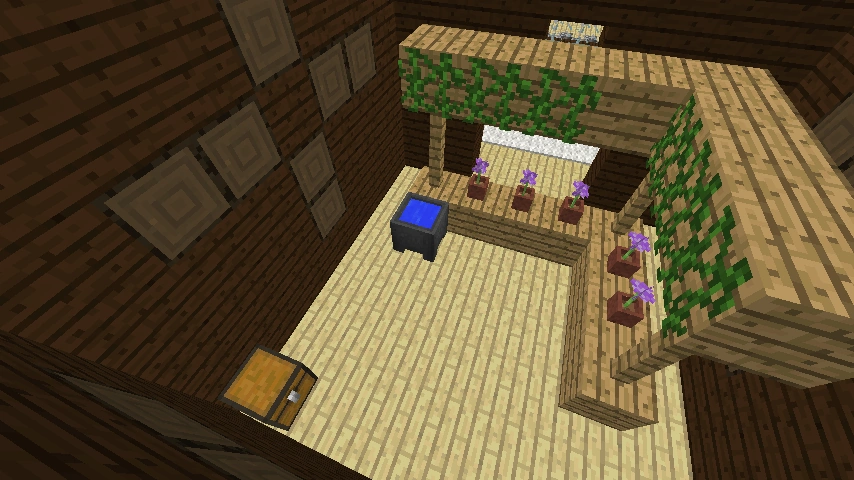 | 1x2_a4 | Pokój z sadzonkami | Pokój z dwoma warstwami rzędów sadzonek ciemnego dębu. Drabinki prowadzą na sufit. Znajduje się tu skrzynia z sadzonkami ciemnego dębu. | 129 Deski