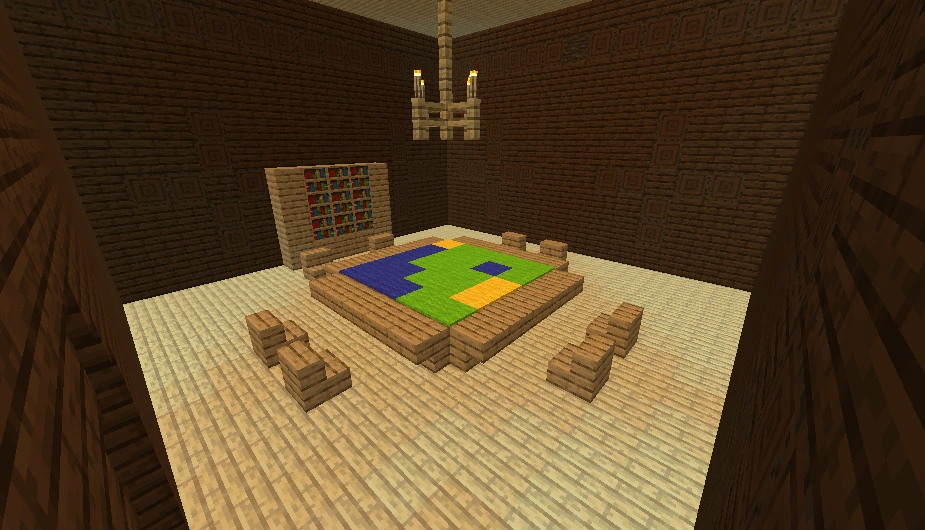 | 2x2_b4 | Pokój z mapą | Pokój z kolorowym dywanem na stole imitującym mapę. Jest tam kilka regałów na książki. Dwóch obrońców i przywoływacz zawsze się tu spawnuje. | 225 Brzozowe deski
