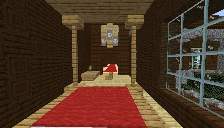 | carpet_south | Korytarz | Niewielki ciąg czerwonych i białych dywanów skierowany na południe wraz z podłogą z brzozowych desek i bocznymi filarami z ciemnych dębowych desek, na których pośrodku zawieszone są od środka ciemne dębowe płoty z pochodniami na ich szczycie. | 24 Brzozowe deski | |