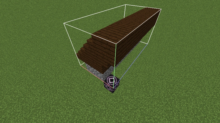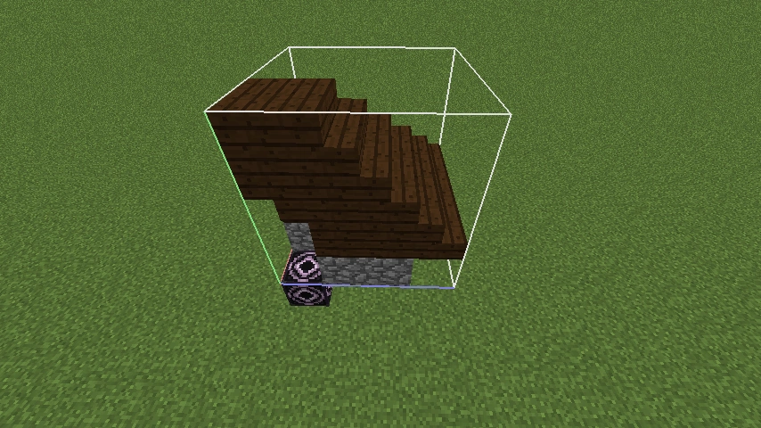 | 1x2_d_stairs | Zakrzywiony pokój schodów | Kilka schodów prowadzących w górę, ozdobionych pixel artem przedstawiającym illagera. | 117 Bruk