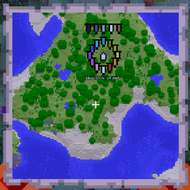 - Centrum, w którym pusta mapa została zmieniona w mapę. Środek mapy jest ustawiony w centralnym punkcie obszaru 8×8 bloków, w którym stał gracz, kiedy stworzył mapę.