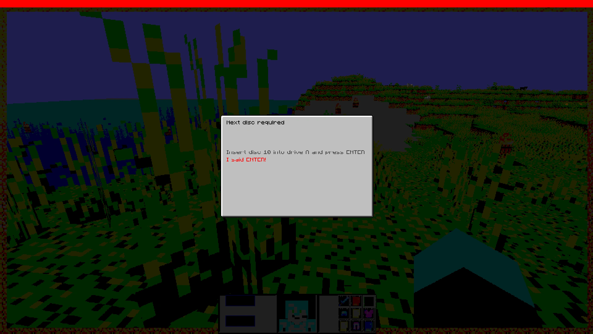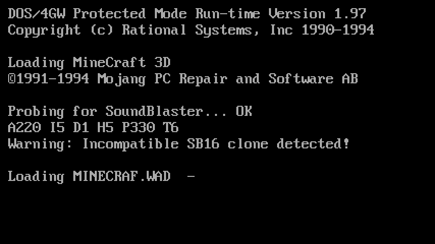 - Ekrany ładowania i zamykania − podczas włączania gry pojawia się przypominający wiersz poleceń ekran, na którym widnieje "By 1991-1994 Mojang Repair and Software... Loading Minecraft 3D" itd. Chwilę po ekran zapełnia białe tło z zielonym napisem na górze "Wersja demonstracyjna", a po momencie uwidocznia się znane logo Mojang AB. Podczas wyłączania gry ponownie zobaczywszy wiersz poleceń z napisem "Thank you for playing Minecraft 3D!", aby wyjść z gry całkowicie gracz musi naciśnąć przycisk ↵ Enter.