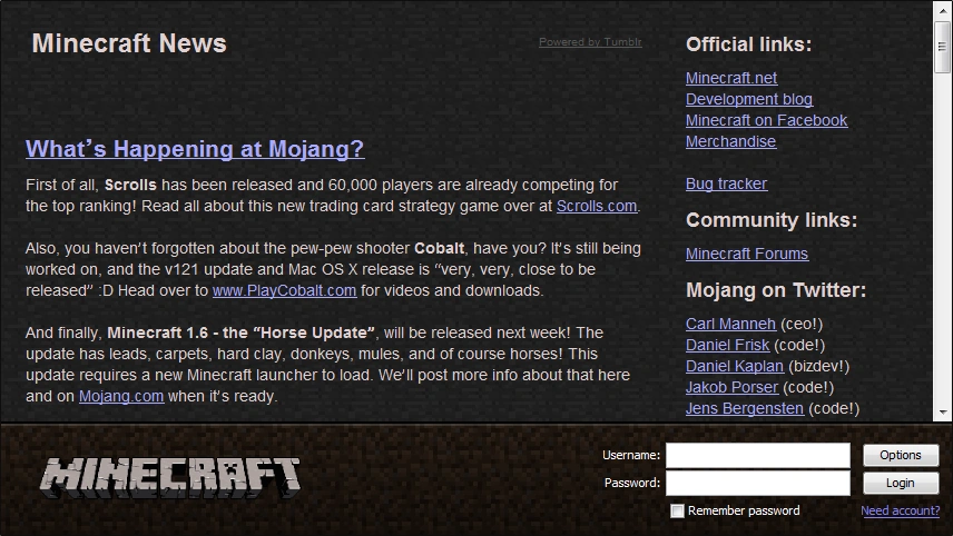 - ↑ http://notch.tumblr.com/post/3428176687/server-downtime-and-a-new-launcher