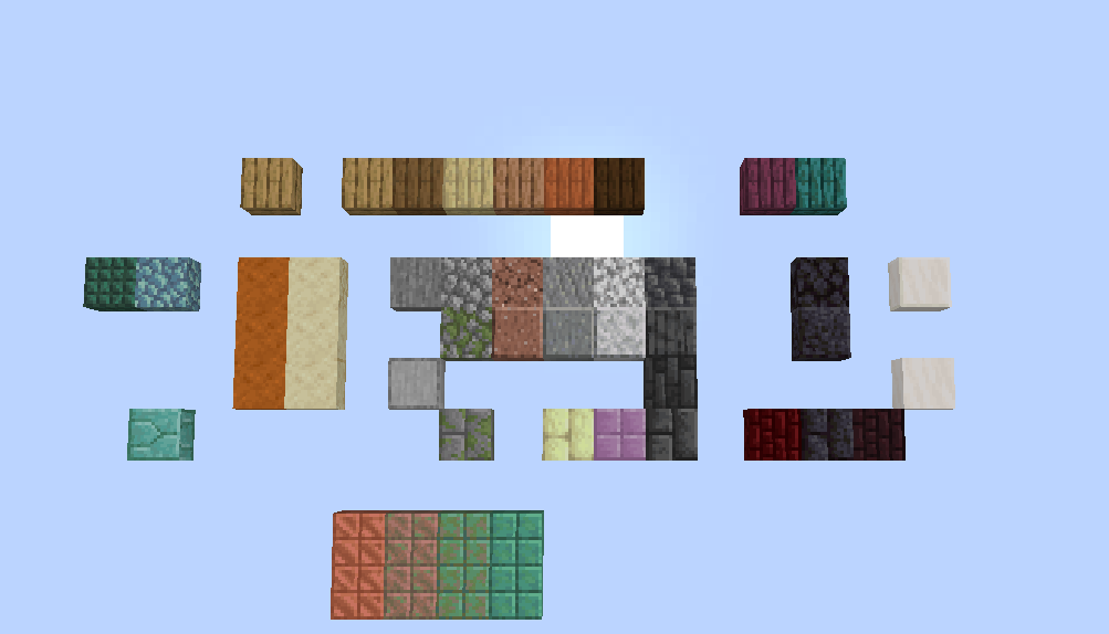 Dębowe deskiŚwierkowe deskiBrzozowe deskiTropikalne deskiAkacjowe deskiCiemnodębowe deskiDębowe deskiPodwójna kamienna płytaPiaskowiecCzerwony piaskowiecBrukCegłyKamienne cegłyBlok Netherowej cegłyBlok Netherowego kwarcuBlok purpuruPryzmarynPryzmarynowe cegłyCiemny pryzmarynKamieńBlok GranituGładki GranitDiorytDioryt GładkiAndezytAndezyt GładkiZamszony brukZamszone kamienne cegłyGrid Gładki piaskowiec (1.14)Grid Gładki czerwony piaskowiec (1.14)Grid Gładki kwarcBlok czerwonej Netherowej cegłyCegły z kamienia Endu