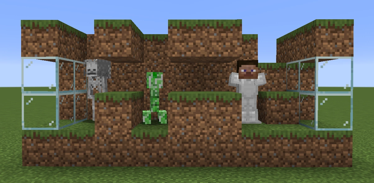 Następnie do dołów należy zaprowadzić Creepera i szkielet lub tułacza - kolejność nie ma znaczenia, ale zaleca się najpierw osadzić w dole tego pierwszego. Creeper powinien znaleźć się w środkowym dole, a szkielet w jednym z bocznych.