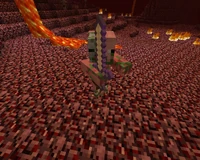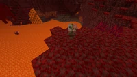 Piglin Kupiec i Portal dostępu do Starożytnych Polowań we wnętrzu Netherowej jaskini. -