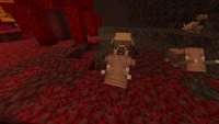 Zdjęcie przedstawia małego Piglina ujeżdżającego małego Hoglina. Zdjęcie pochodzi ze szkarłatnego lasu. -