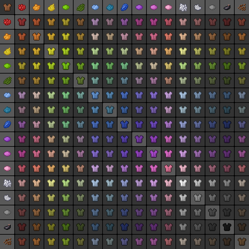| 1.0.8 | Zmieniono wełnianą zbroję na skórzaną; robi się ją teraz ze skóry. Wcześniej zbroja wełniana miała niższy poziom. | ||||