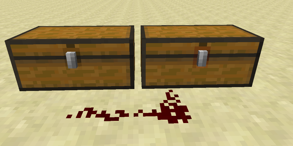 Baús (à esquerda) e baús de armadilha (à direita) podem ser colocados um ao lado do outro. O pó de Redstone se configurará para apontar para baús com armadilha, mas não para baús regulares.