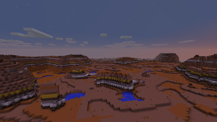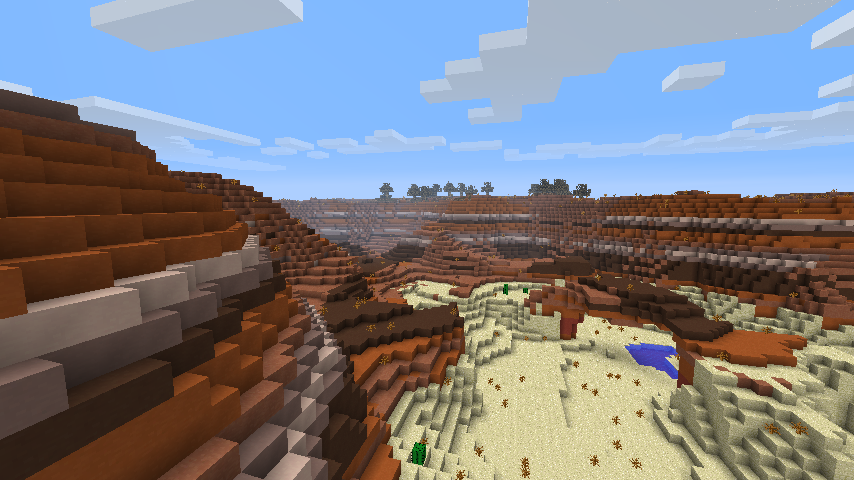 Mesa é um bioma raro, exótico feito da argila endurecida e argila tingida, com arbustos mortos em todo semelhante a um deserto. Areia Vermelha também vai gerar aqui em vez de areia da regular, com ocasionais cactos. Sua composição é útil quando outras fontes de argila são escassas. No entanto, encontrar um Mesa pode ser difícil devido à sua raridade. |