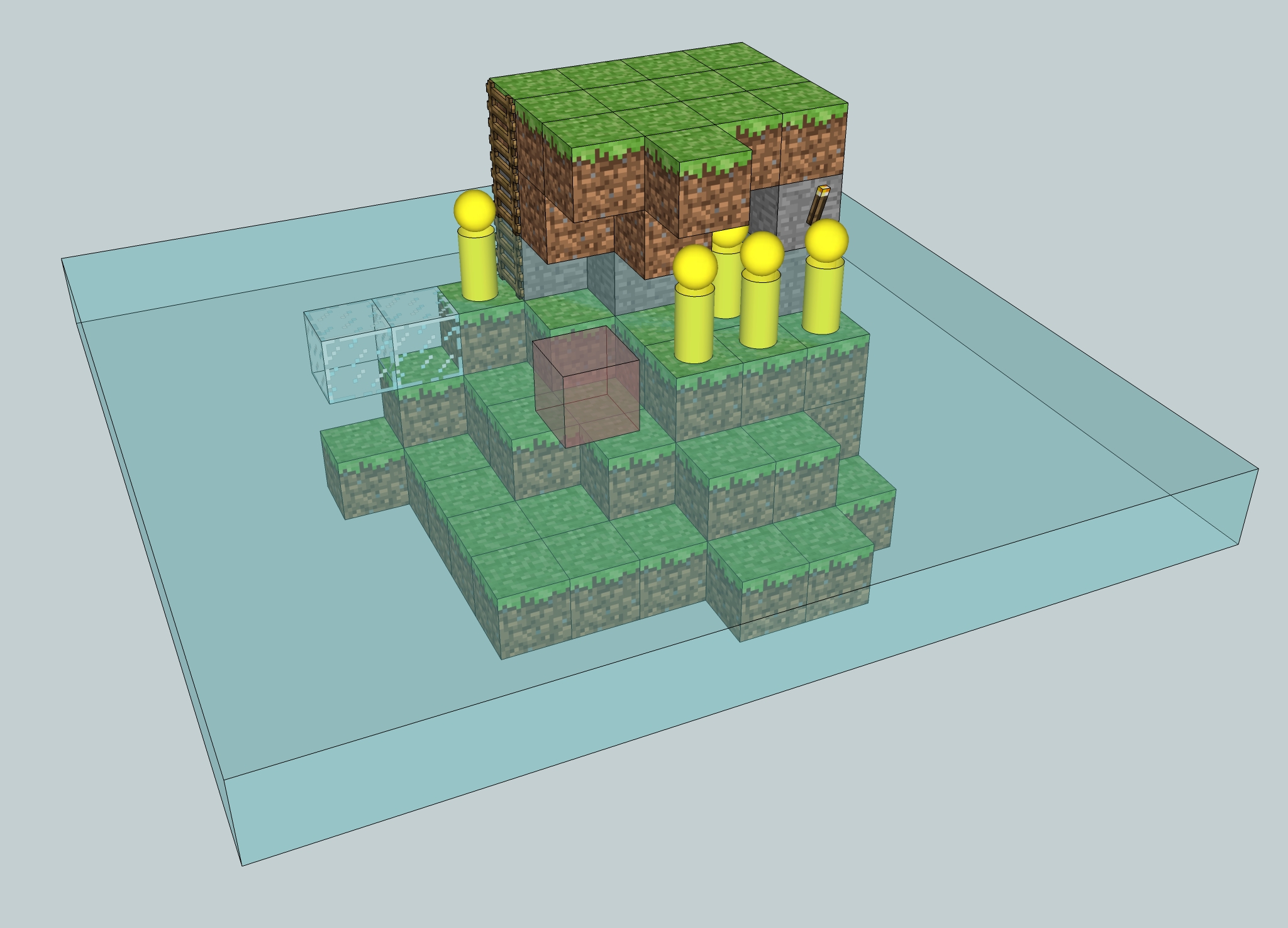 Exemplo de geração em massa. A área de geração 41×1×41 é sombreada em azul (sem escala). As figuras amarelas representam as posições reais nas quais os monstros podem aparecer depois de verificar o ambiente. Observe que as criaturas pode aparecer dentro dos blocos da cocha e da escada. Mas eles não podem aparecer em cima do vidro porque não é opaco. O cubo vermelho é o centro do pacote