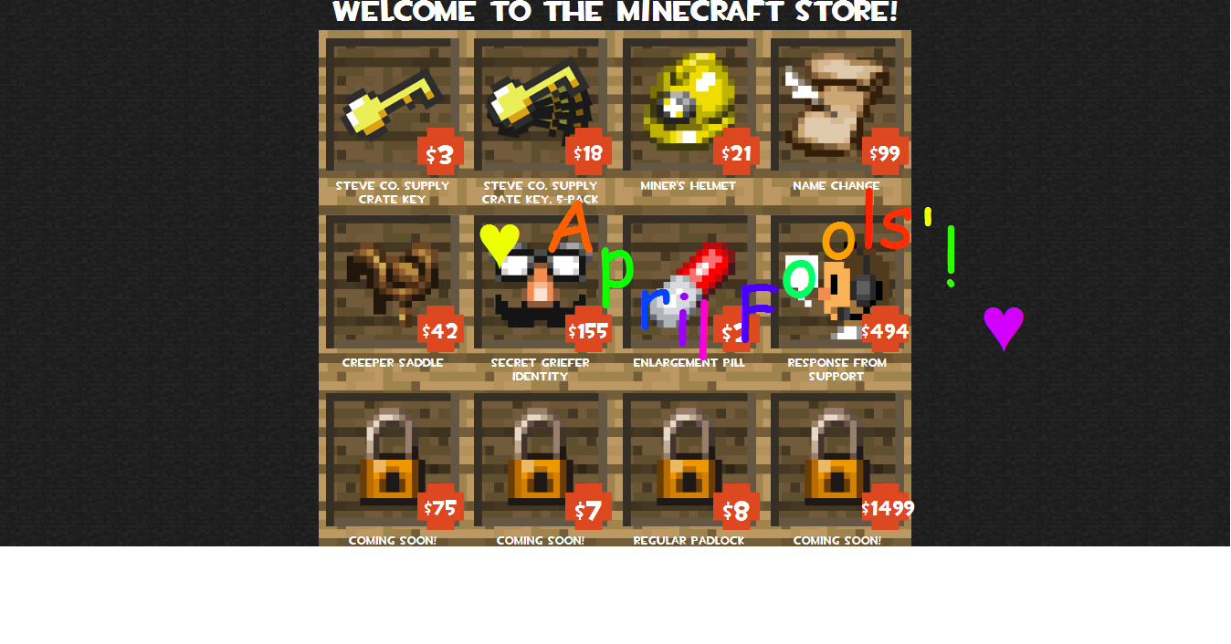 - Edições Bedrock e Console Legado, e o site do Minecraft tem sua própria "Loja do Minecraft". No entanto, eles são lojas reais do jogo usadas para obter conteúdo para download, comprar a Edição Java e também mercadorias do Minecraft, não têm nenhuma relação com a piada do Dia da Mentira.