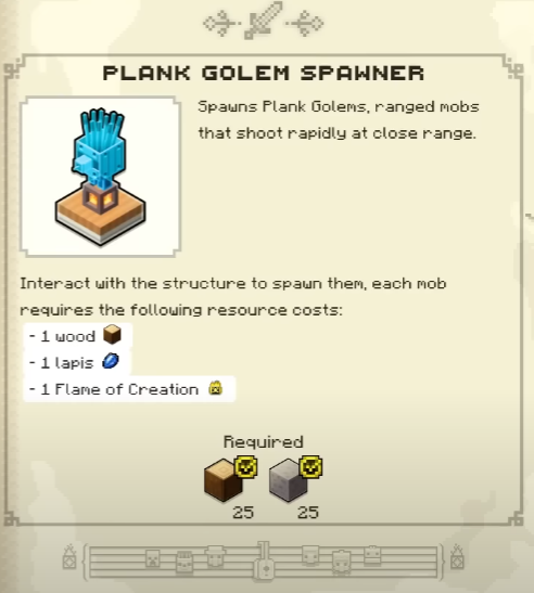 Os invocadores do golem de tábua podem ser colocados utilizando um assistente de construção, o que custa 25 madeiras e 25 pedras.