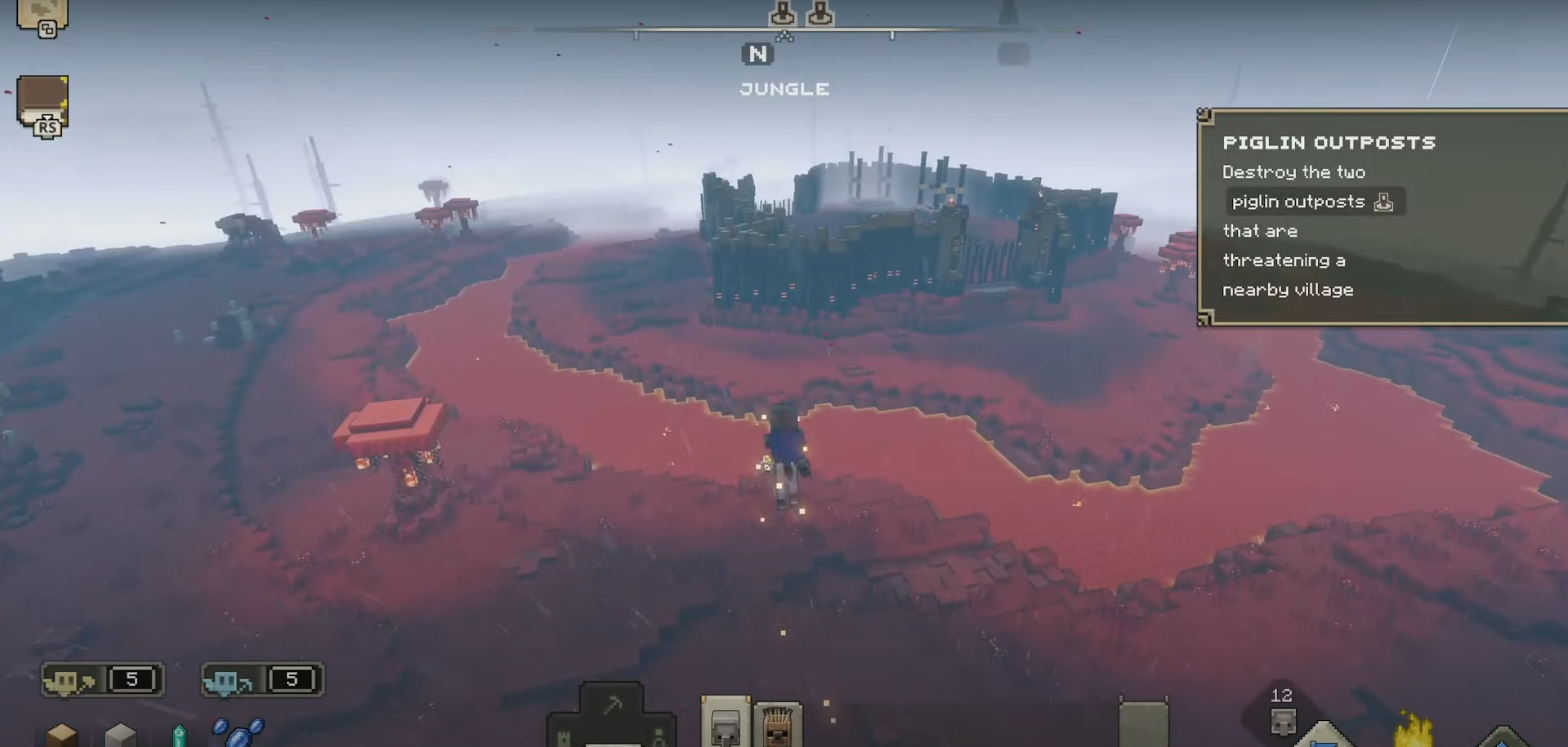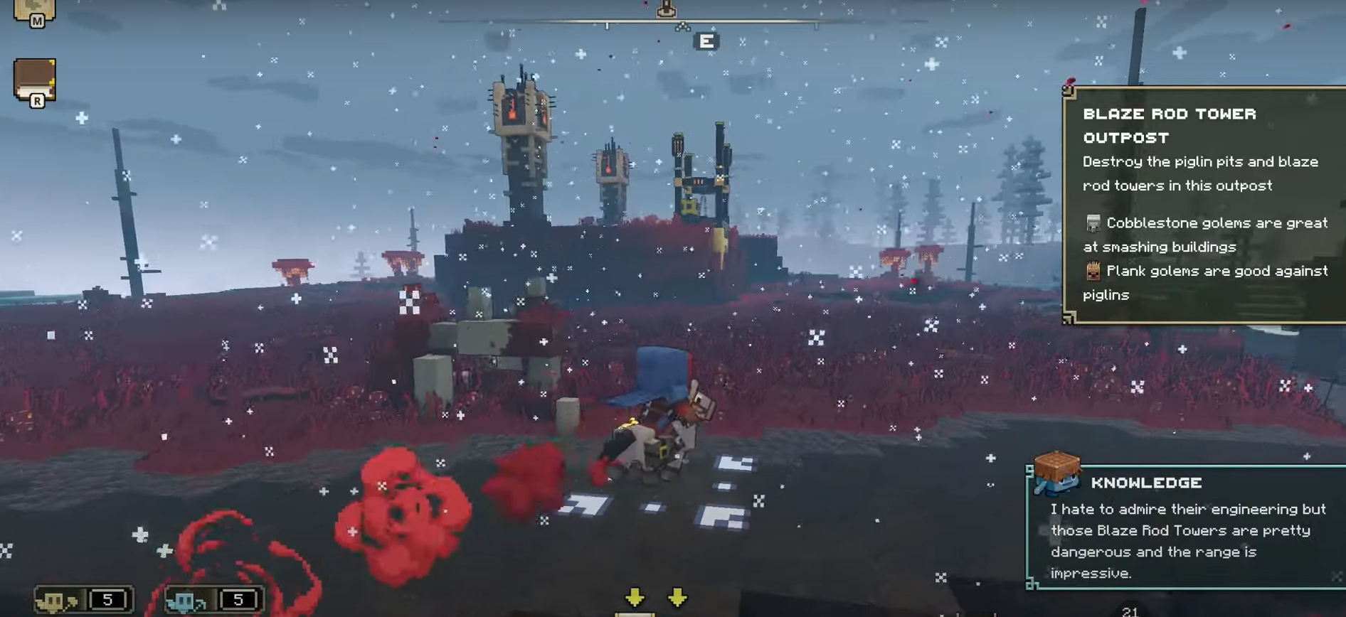 | Posto avançado da Torre de Vara Incandescente | Defensivo | Repleto de torres de vara incandescente, poços piglins e gaiolas cheias de criaturas capturadas. |