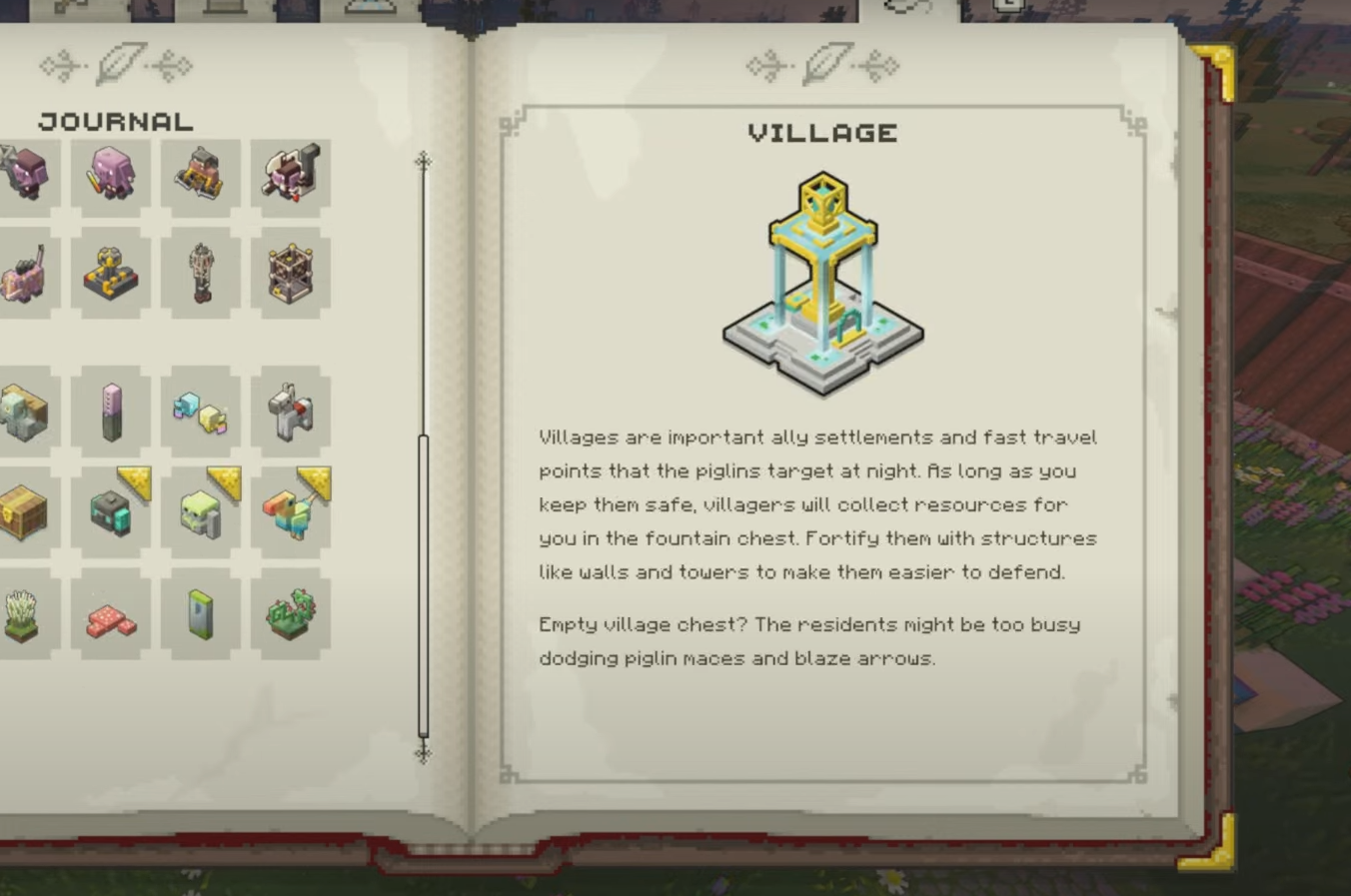 As vilas são importantes comunidades de aliados e pontos de transporte rápido que são alvo dos piglins durante a noite. Desde que você os mantenha seguros, os aldeões coletarão recursos para você no baú da fonte. Fortifique-os com estruturas como muros e torres para que fiquem mais fáceis de defender. Baú de vila vazio? Os moradores podem estar muito ocupados desviando de maças de piglins e flechas de blazes.