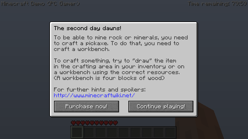 - A segunda mensagem de dica tem o antigo endereço da Minecraft Wiki, em http://www.minecraftwiki.net.