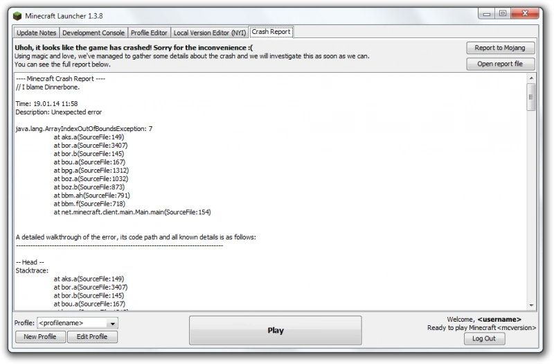 Ранее после каждого аварийного завершения игры появлялся отчёт, но это было убрано. Однако отчёт об ошибке иногда может появиться на мгновение, прежде чем игра закроется. Лаунчер Minecraft отобразит отчёт об ошибке перед запуском игры, кроме того, он останется, не позволяя вам играть.