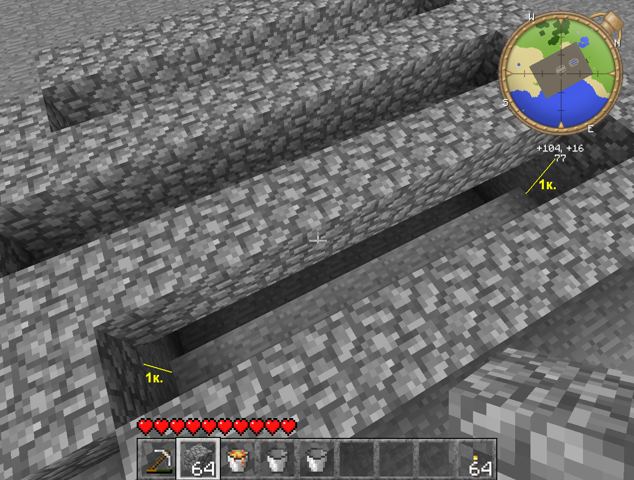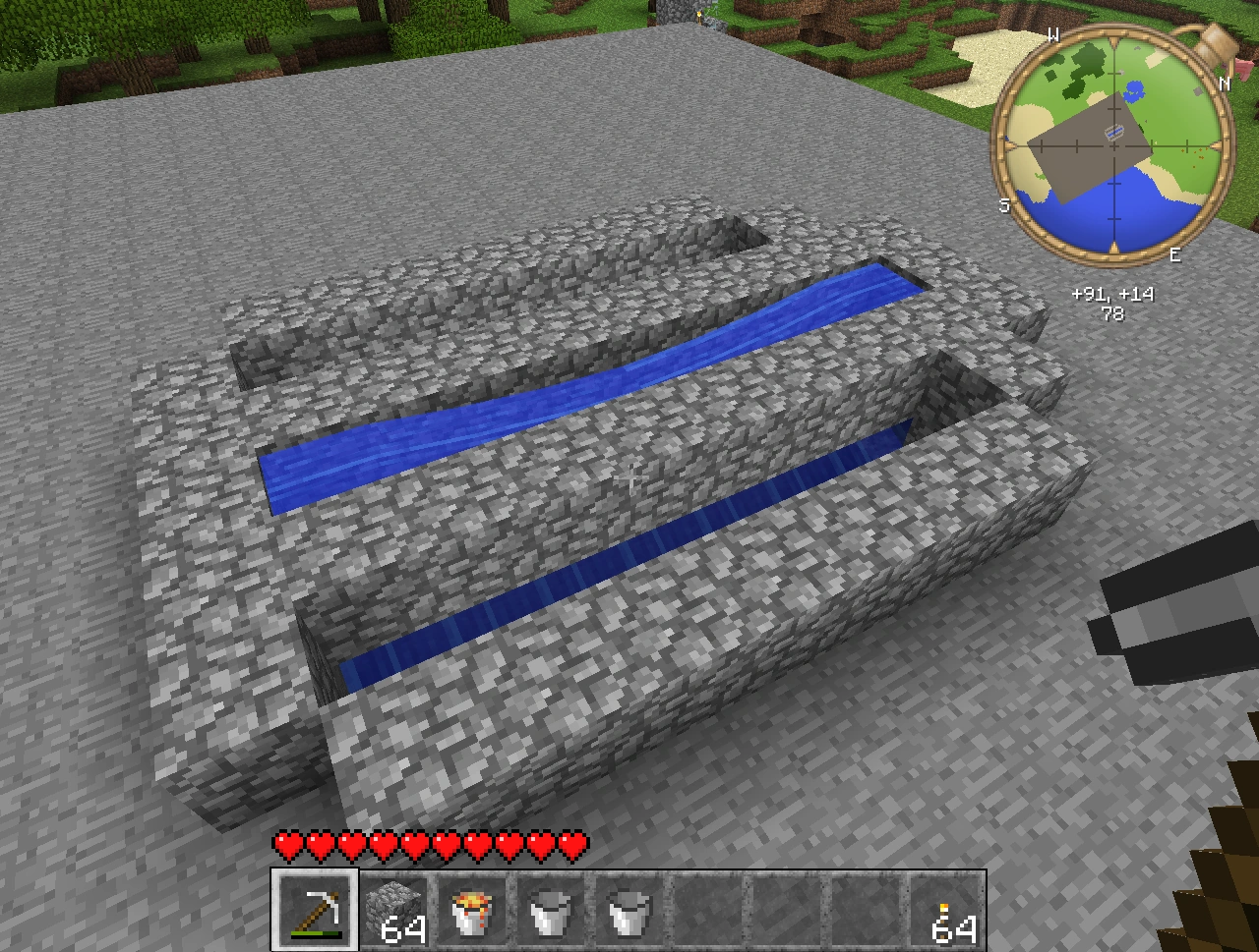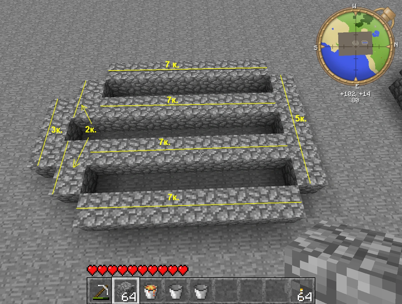 Этап 2. Углубляем внешние канавки на 1 блок. Берём один куб внутрь и снова выкапываем 1 куб вниз так, чтобы получились 2 "мостика" посередине строения. Повторяем операцию на другой стороне.