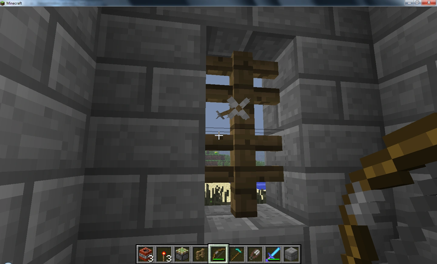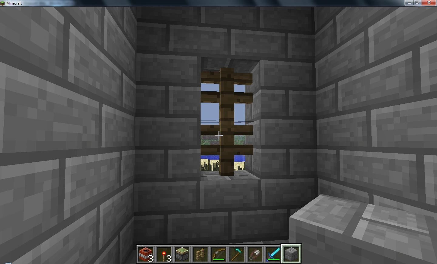 Начиная с версии 1.0.0, забор присоединяется к соседним блокам, поэтому его можно ставить в оконные проемы вместо стекла. В результате получается подобие бойницы (похожие окна можно увидеть в адских руинах, только там они сделаны из адского забора). Однако это именно подобие, стрелять через него не получится - для стрел забор является полным блоком, поэтому они будут втыкаться в него (если прицелиться в пустое пространство вокруг забора, стрела все равно воткнется и повиснет в воздухе). Тем не менее, такие окна являются неплохой альтернативой стеклянным, если песка поблизости нет, или у вас дефицит топлива.