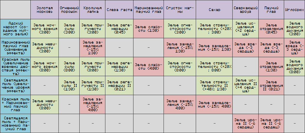 | Зелье огнестойкости | 3:00 | Огнестойкость | Даёт иммунитет к урону связанным с огнем(например: сгорание в лаве) | |