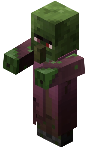 | Зомби-жители могут появиться вместо обычного зомби, либо когда зомби убьёт жителя. Его можно вылечить, кинув в него взрывное зелье слабости и кликнув ПКМ с обычным золотым яблоком в руках. | |||||