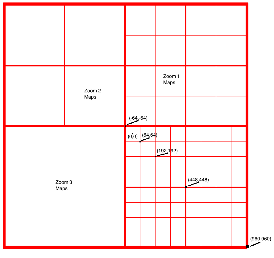 Диаграмма, показывающая как карты уменьшались до версии 1.8. Обратите внимание, как большие карты имеют границы, состоящие из половины и четверти небольших карт.