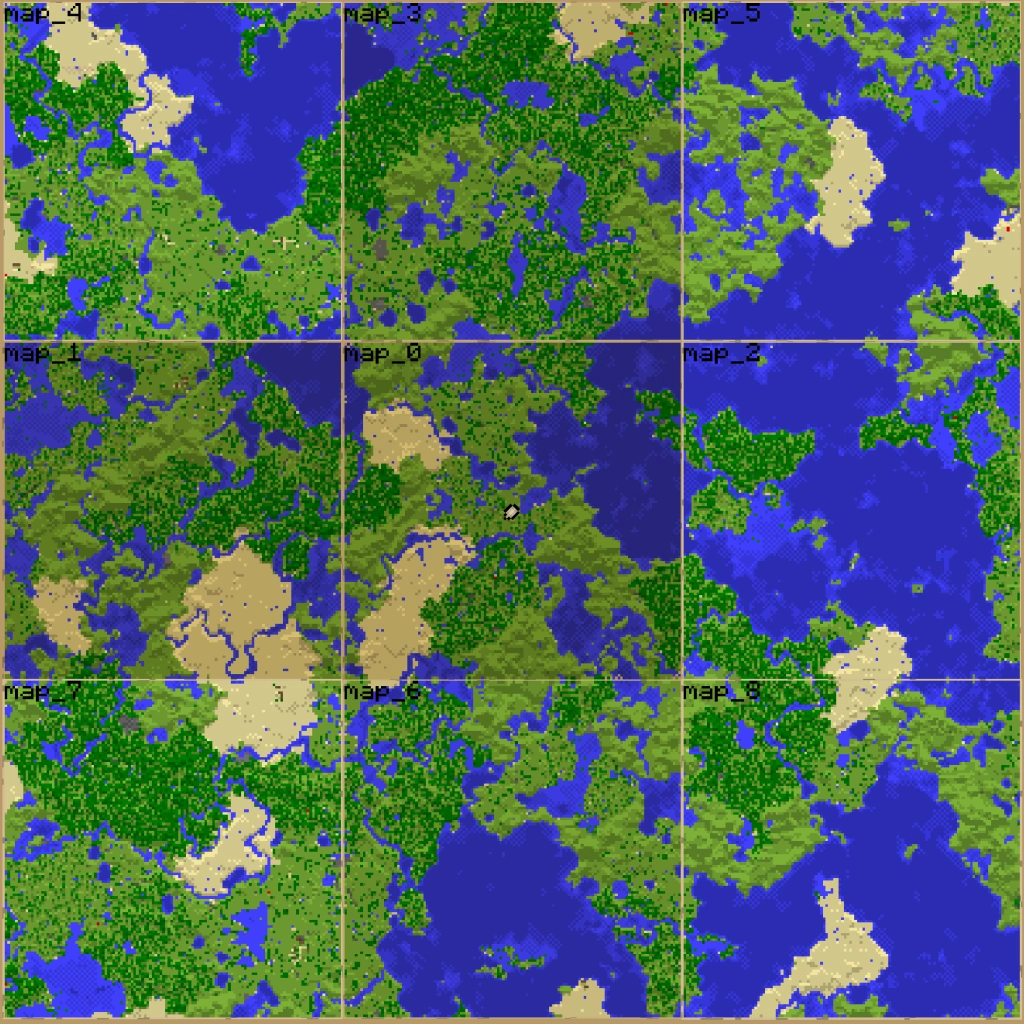 При первом использовании карта не центрируется по игроку, мир разбит на большие невидимые квадраты и карта отображает тот, где первый раз используется. Это сделано для того, чтобы у разных карт одного масштаба не было перекрытий, и при вставке карт в соседние рамки можно было получить ещё большую карту. Соответственно, чтобы начать рисовать другой квадрат карты, нужно её первый раз использовать за пределами уже изученного квадрата.