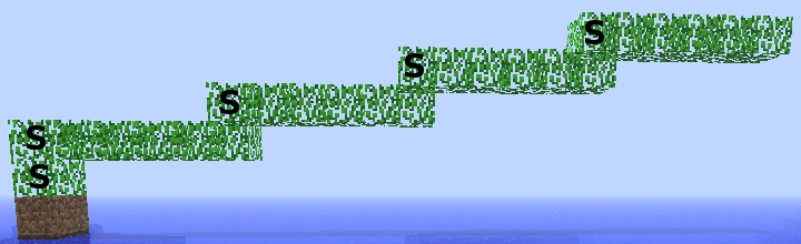 На следующих изображениях поддерживаемая листва отмечена буквой «S», а соединённые с ней блоки листвы пронумерованы от 1 до 5 по расстоянию до ближайшего поддерживаемого блока листвы. Листва, размещённая на позиции, отмеченной красной буквой «X», отмирает.