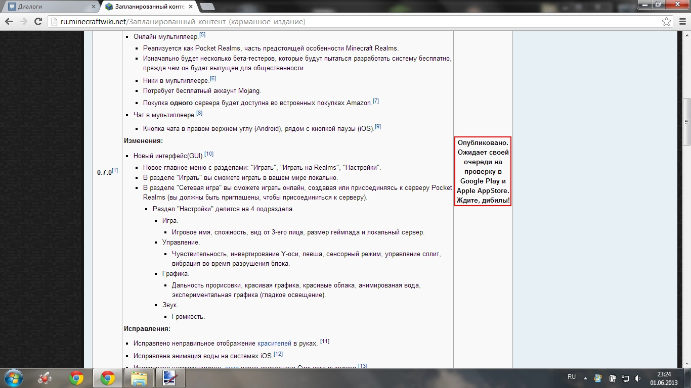 например: выход версии покет эдишона 0.7.0!!! Нет не точно 6 июня выходит -_- да знаю... проверка приложений слишком много вр. занимает:)