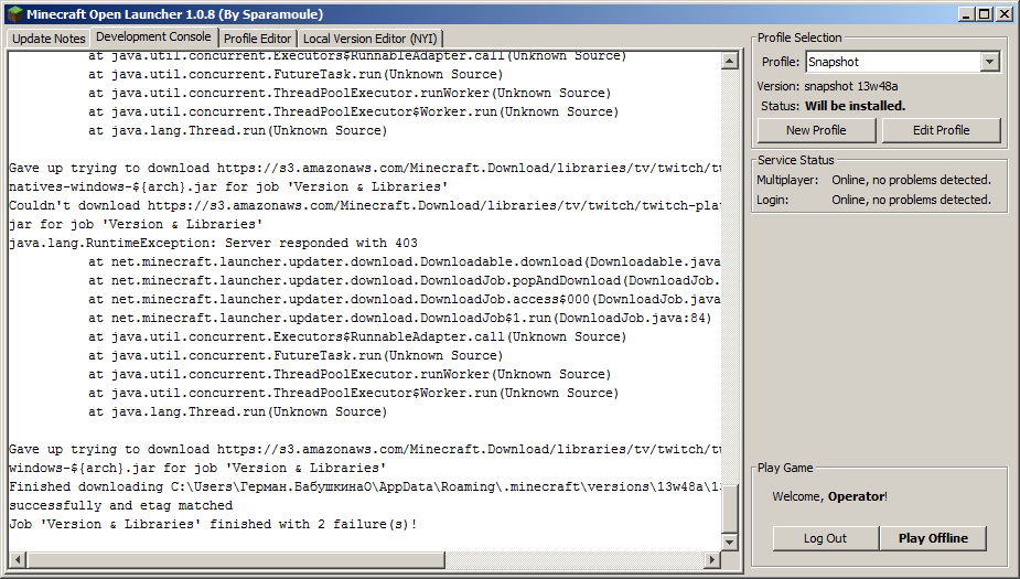Не загружется twitch-платформа: «Couldn't download https://s3.amazonaws.com/Minecraft.Download/libraries/tv/twitch/twitch-external-platform/4.5/twitch-external-platform-4.5-natives-windows-${arch}.jar for job 'Version & Libraries'» Кто сможет выложить папку libraries в папке майнкрафта (вся проблема там), буду очень благодарен. Или twitch-платформу можно где-то скачать? 89.169.147.157 08:45, 24 ноября 2013 (UTC) (Operator (обсуждение))